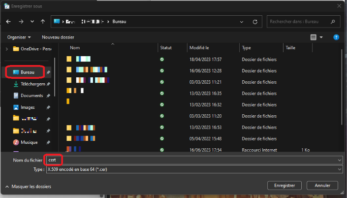 > Cliquer sur "Parcourir" afin d'enregistrer votre certificat sur votre bureau :