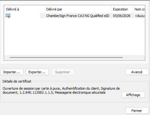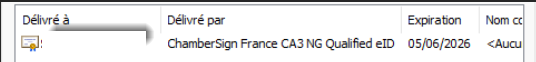> Dans l'onglet "Contenu", cliquer sur "Certificats", sélectionner le certificat concerné repérable par la colonne "Délivré par" qui indique le fournisseur de votre clé :