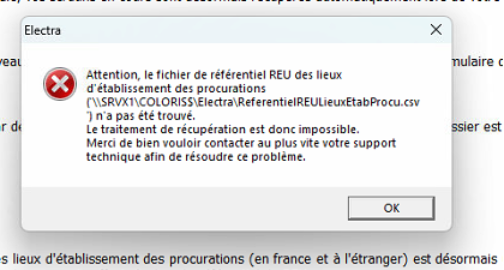 Je rencontre une erreur 'Le fichier de référentiel REU des lieux d'établissement des procurations n'a pas été trouvé'.
