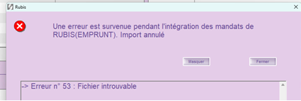 Si vous rencontrez cette erreur "Une erreur est survenue pendant l'intégration des mandats de RUBIS (EMPRUNT). Import annulé." :